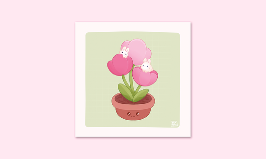 Frühlings-Tulpenhasen, 15 x 15 Kunstdruck | Quadratischer Kunstdruck mit Häschen in Pastell | Grußkarte | Leinenkarton | Wohndekor | Wandkunst