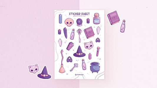 Pastellfarbene Hexenhütten-Aufkleber | A6-Aufkleberbogen in matt oder glänzend | Vinyl-Aufkleberbogen zum Thema Hexerei | Tagebuch | Kinderillustration | Miamouz