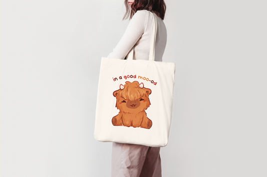 In A Good Moo-od | Süße Tragetasche mit Hochlandrind, 100 % Baumwolle | Einkaufstasche | Jutetasche | Kunst-Geldbörse | Großer Shopper | Kuhliebhaber | Miamouz