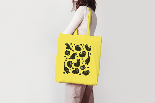 Gelbe Void-Katzentasche | Süße Einkaufstasche mit schwarzen Katzen 100 % Baumwolle | Einkaufstasche | Jutetasche | Kunst-Geldbörse | Großer Shopper | Liebhaber schwarzer Katzen | Miamouz